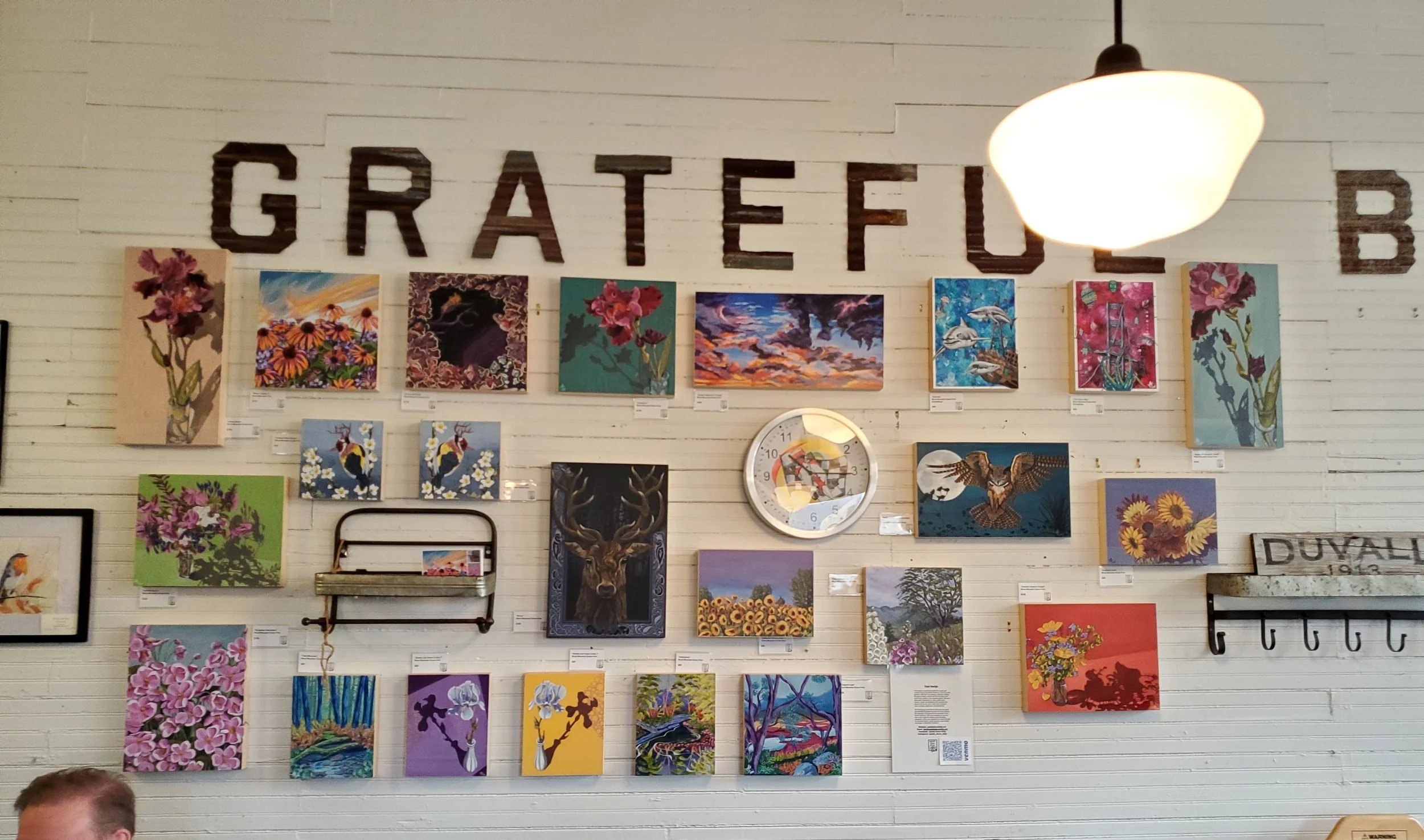 The Grateful Bread bakery in Duvall, WA displays creative artistic works from local artisans. I reached out to Grateful Bread when I had some of my originals displayed on the Duvall Foundation of the Arts exhibition wall located at Duvall City Hall. I thought it would create a great sense of connectivity and synergy for me to exhibit some of my unique and exclusive prints at The Grateful Bread bakery.